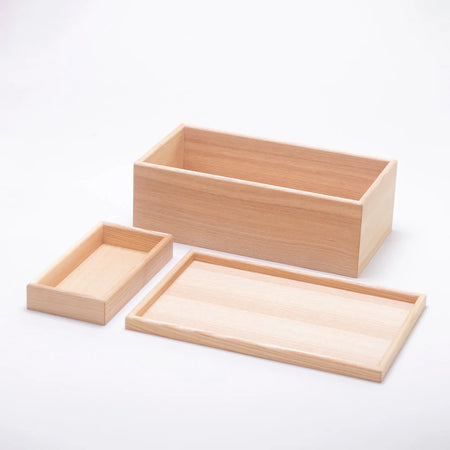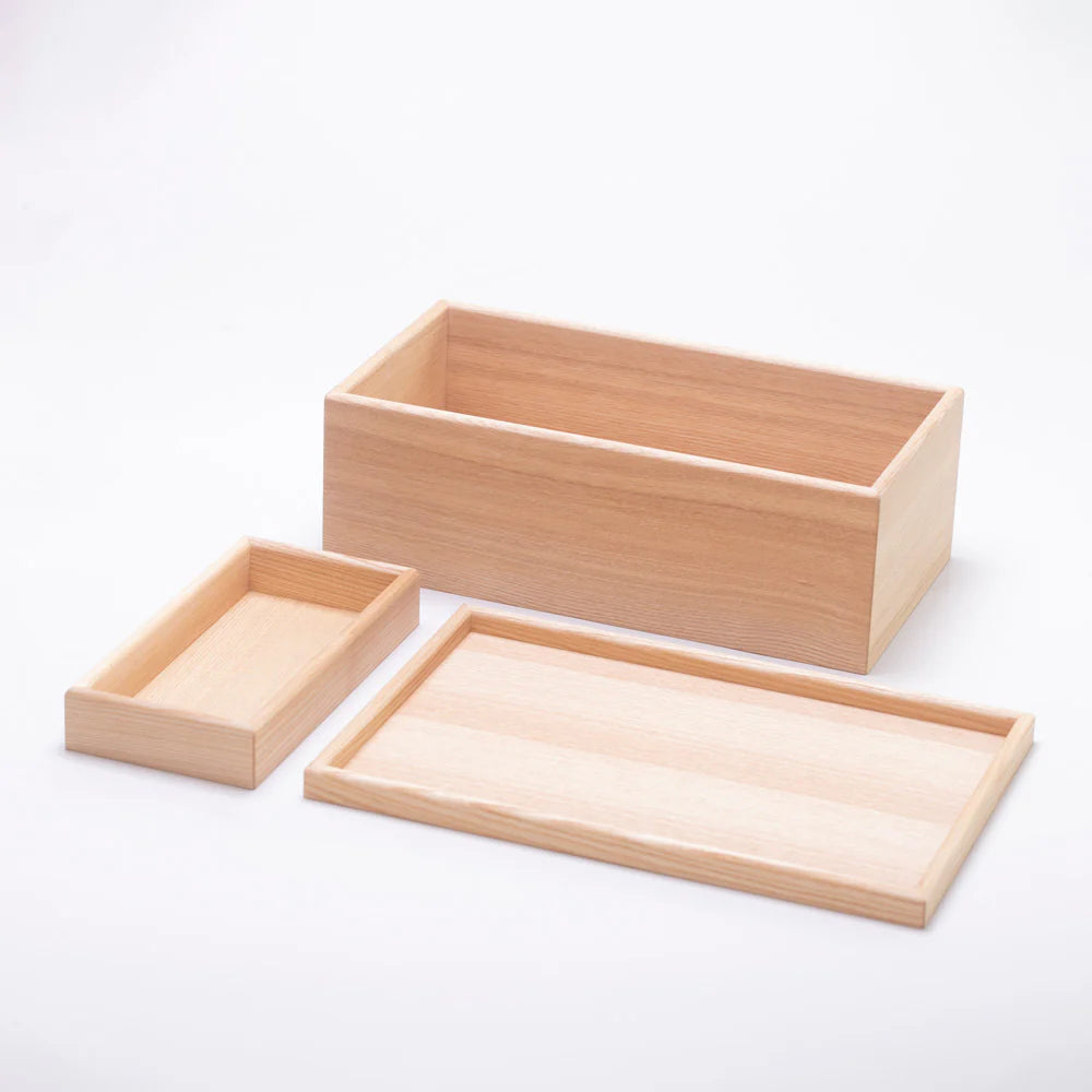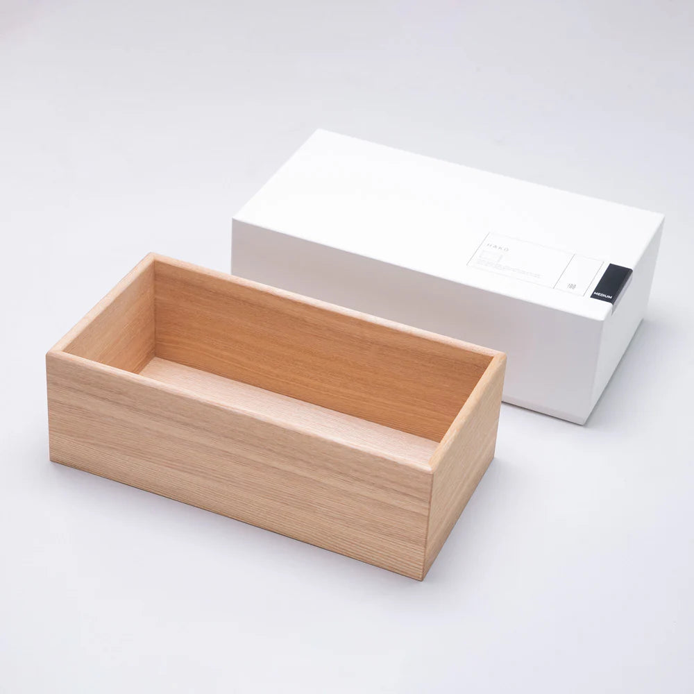 A carefully handcrafted wooden box. Placed on a desk, a high-quality wooden box can soften and elevates the surrounding atmosphere. It can be used for various purposes such as holding pens, copy paper, or even small paperbacks, serving as a miniature bookshelf. Each box is handmade at a woodworking factory in Shizuoka, without glue or hardware.