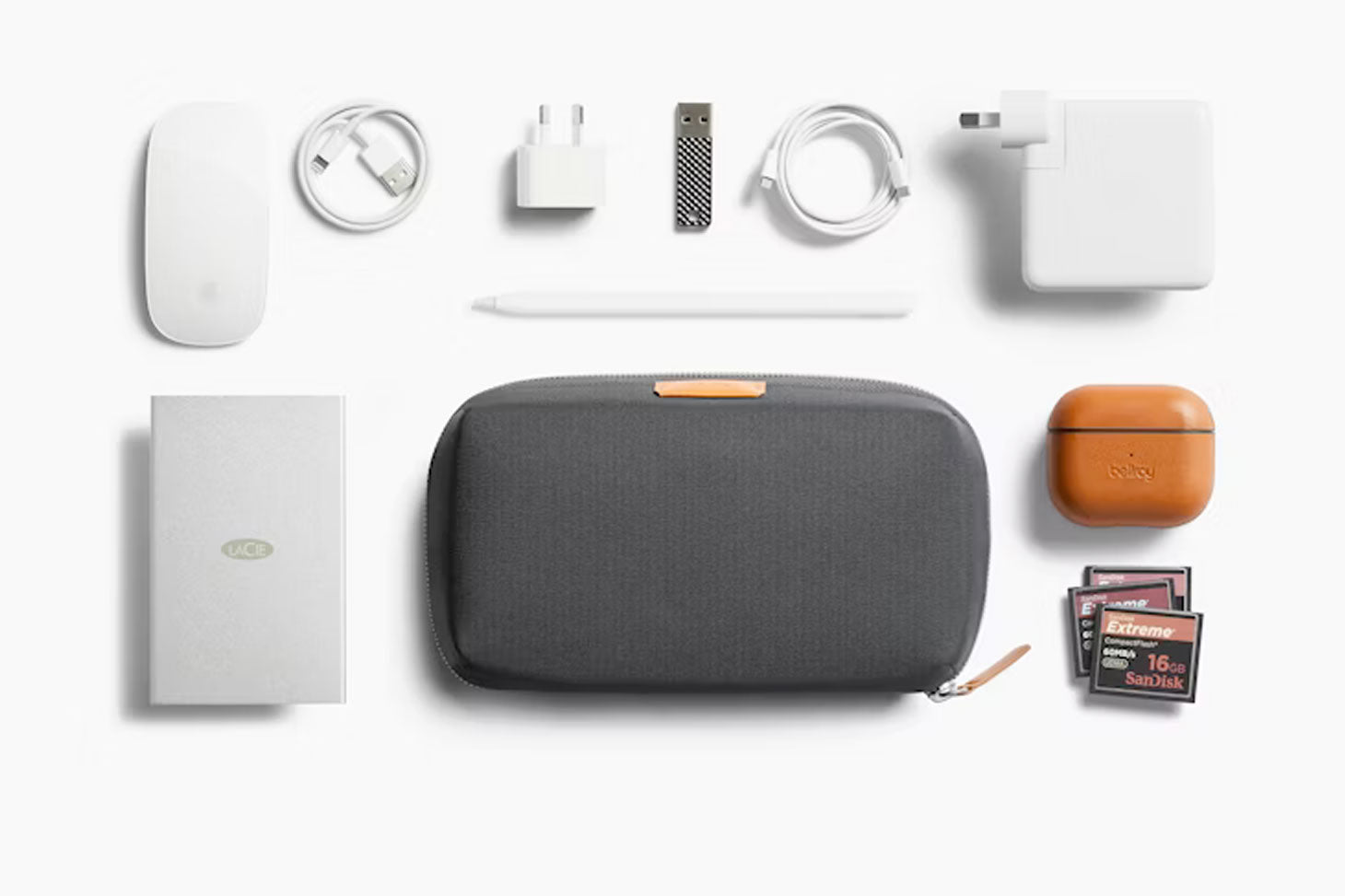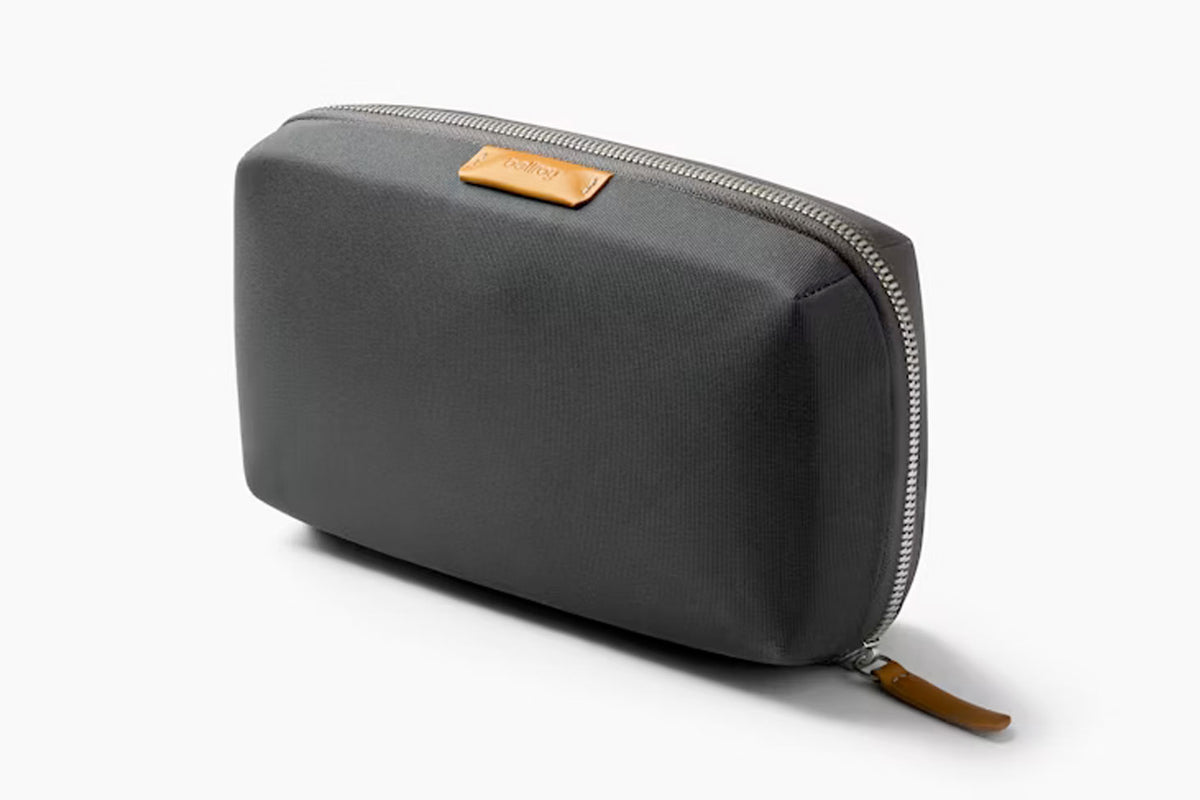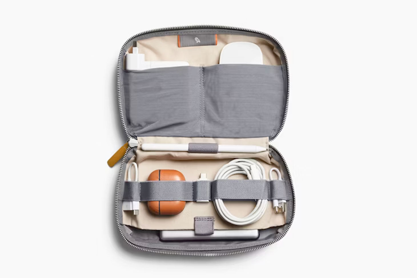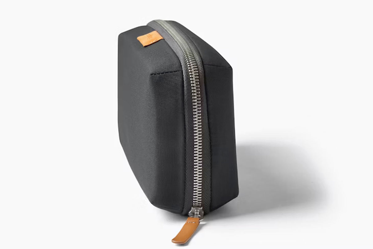 Organize your tech accessories without tangles. This generously sized kit keeps everything smooth and sorted. A magnetic slip pocket fits your power bank, stretch mesh takes a mouse, and an elastic strip organizes cables. The zip opening hinges right out to give full access to your tech, making it easy to restore order once you’re done. A floating wall inside this kit stretches out on elastic, to hold items of various thicknesses without taking up excess space.