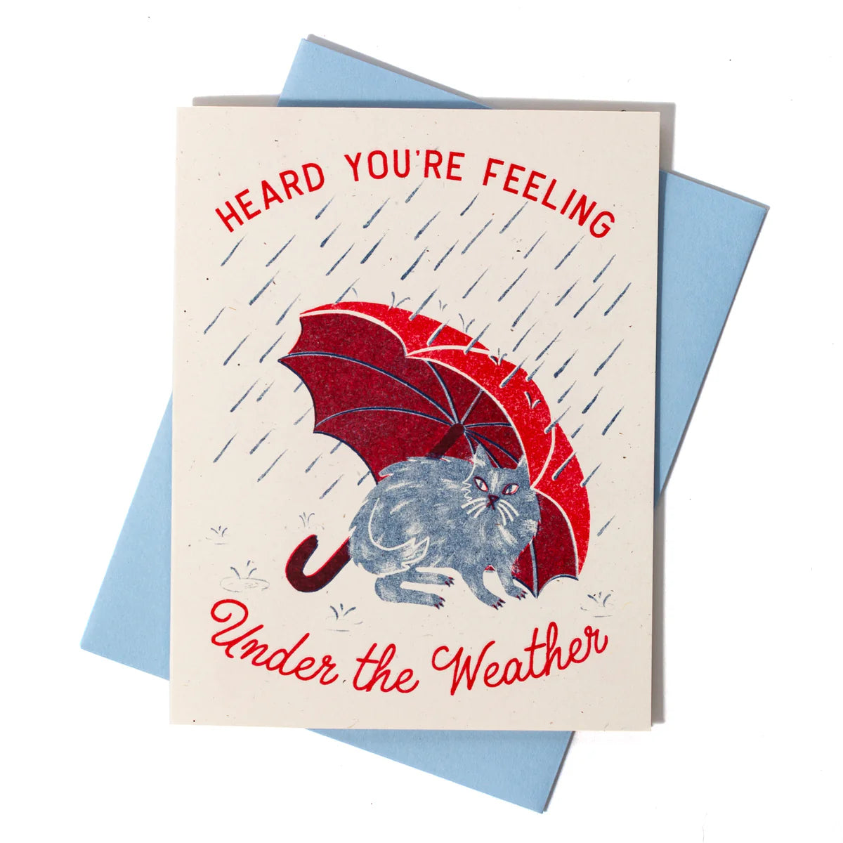 Send "Get Well" wishes with this card, featuring a cat who is sheltering from the weather under a big red umbrella. Risograph printed in bright red and federal blue.