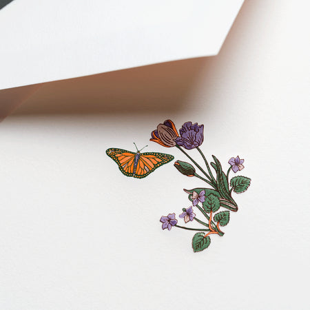 Let nature inspire your correspondence with this pearl white folded note. Featuring a delicately engraved butterfly fluttering among wildflowers, the design comes to life with soft shades of green, purple, and orange. Perfectly balanced between sophistication and whimsy, this note is ideal for personal letters, thank you notes, or heartfelt messages. Crafted on luxurious paper, its smooth finish makes every word feel special. The matching envelopes are lined in the orange of the butterfly.