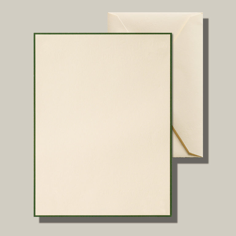 Enrich your correspondence with the Hunter Green Bordered Ecru Half Sheet from Crane Stationery. Crafted from our signature 100% cotton paper, this elegant writing sheet showcases a warm ecru hue framed by a rich hunter green border, offering a sophisticated backdrop for your thoughts. Lightweight yet durable, this premium stationery is perfect for personal notes, professional messages, and heartfelt letters. Each sheet is accompanied by a matching, unlined ecru envelope, ensuring your words are delivered with timeless style. Whether you're dashing off a quick note or penning a thoughtful letter, this refined choice brings a touch of distinction to every message.