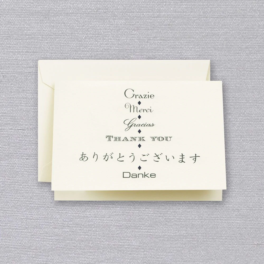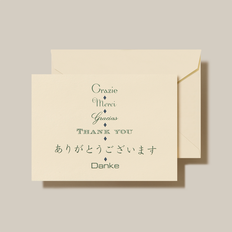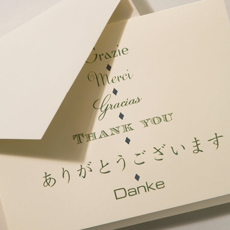 Sometimes saying "Thank You" doesn't quite feel like enough. Our Multilingual Thank You Note helps you express yourself emphatically with words of gratitude in six languages. Printed using raised, glossy thermography in hunter green on all-cotton, warm white paper, this design feels lovely in the hand.
