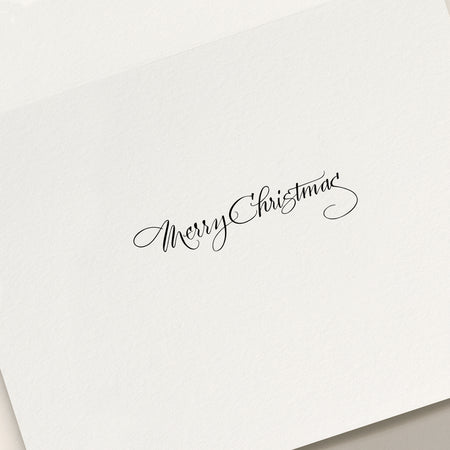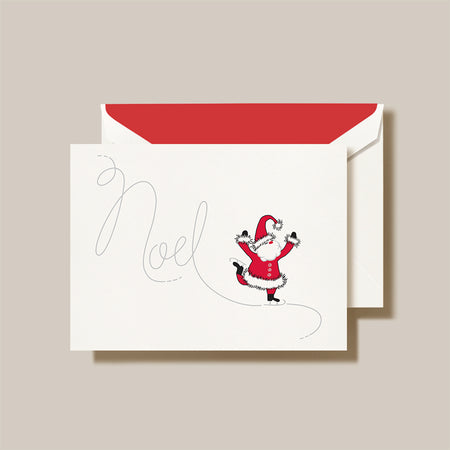 A whimsical winter scene featuring a joyful Santa Claus, dressed in his classic red suit and hat, gliding gracefully across the card. With all the glee of the season, Santa carves a shiny, foil "Noel" into the ice with his skates, leaving behind a trail of festive cheer. The card opens to read "Merry Christmas" printed in black. The matching envelope is lined with scarlet.