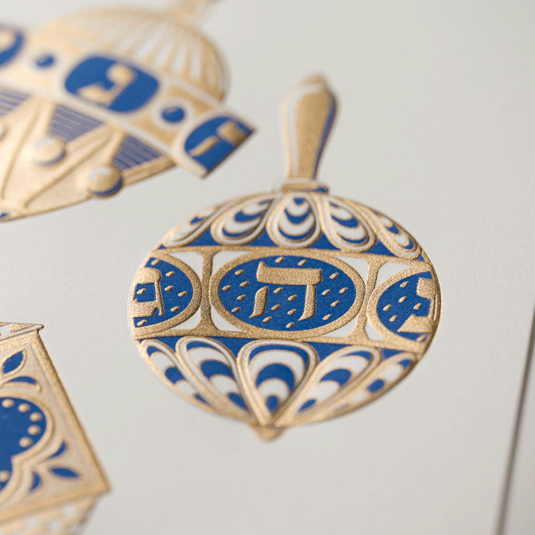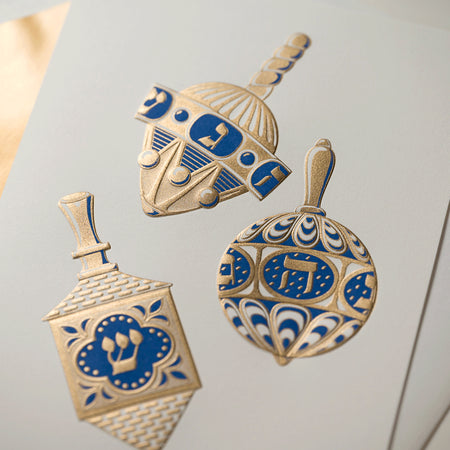 Celebrate the season with joyful motion and timeless artistry. The Spinning Dreidels Hanukkah Greeting Card features three beautifully detailed dreidels, deeply engraved to appear in graceful motion. Rendered in rich gold and layered with blue, the design captures the energy and spirit of Hanukkah with elegance and depth.