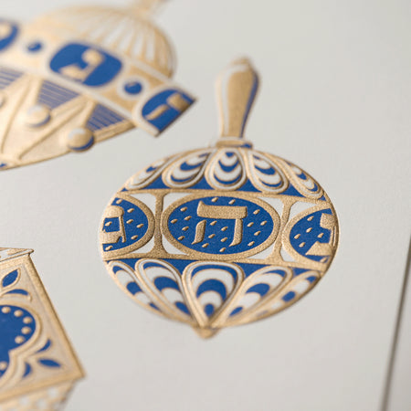 Inside, a heartfelt message—"Wishing you the light of peace, the joy of health and happiness all through the year. Happy Hanukkah"—is digitally printed in regent blue ink. Paired with an envelope lined in luminous satin gold, this card is a radiant expression of holiday cheer and well wishes.