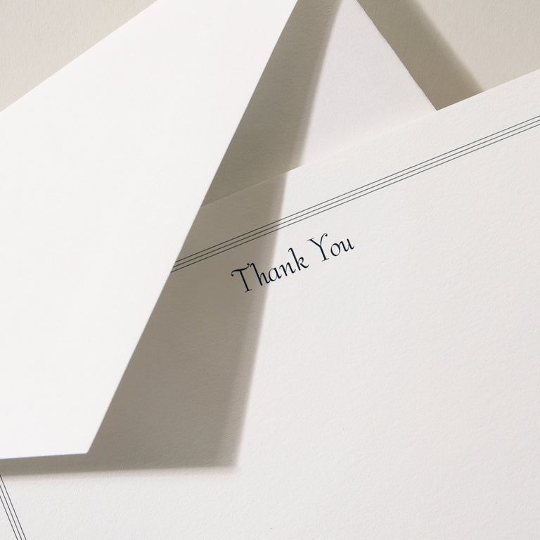 Navy and pearl white create a buttoned-up, classic air that's just as handy for professional thank you notes as it is for personal ones. Crafted from our heavyweight, all-cotton paper and printed with a fine, triple-hairline border, recipients will appreciate your heartfelt acknowledgement when they slide this timeless card from its matching envelope.