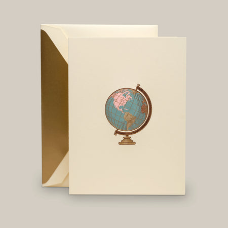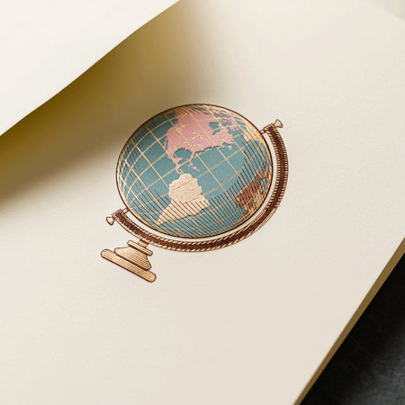 A sophisticated ecru side-folded note featuring an exquisitely engraved vintage globe, capturing the spirit of exploration and discovery. Paired with a coordinating satin gold-lined envelope for a refined touch. Perfect for worldly correspondents, heartfelt notes, and distinguished messages.