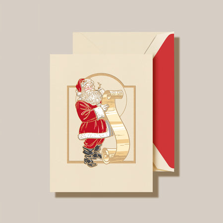 Step back in time and embrace the nostalgic charm of the season with our Vintage Santa with List Christmas card. Exquisitely engraved with intricate detail, this timeless design captures the essence of holiday tradition as Santa meticulously checks his list, ensuring every wish is granted with care. The vintage-inspired artwork evokes a sense of warmth and wonder, transporting recipients to a bygone era of yuletide magic. Santa's jolly expression and the meticulous craftsmanship of the engraving create a captivating scene that embodies the spirit of giving and goodwill. This card opens to read "Merry Christmas" printed in red. The matching envelope is lined with scarlet.