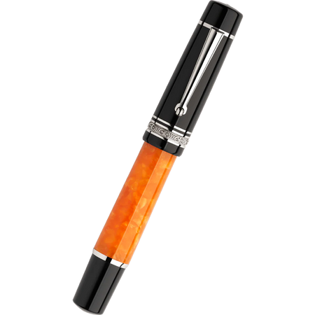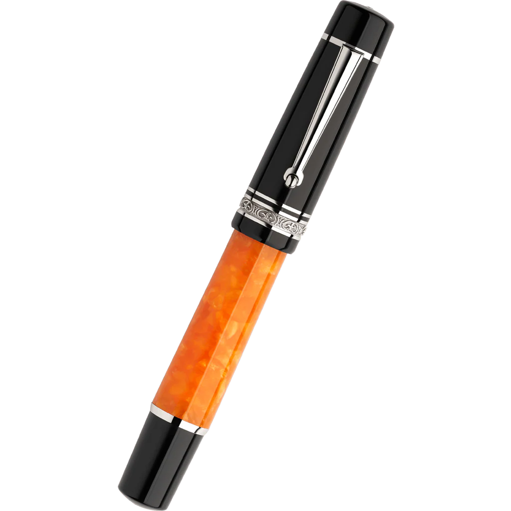 In 2023 Delta makes a captivating comeback with the introduction of the timeless DV Original Mid-Size collection! This new yet familiar collection invites you for a delightful celebration of the sweet life in beautiful Naples, Italy. Friendship and festivity, art and dance, music and laughter — The true joys of life are the inspiration behind this invigorating collection. The DV Original is embodied in an acrylic resin barrel cast in a brilliant tiger orange with a handcrafted silver band, all made using old skills passed down through generations.