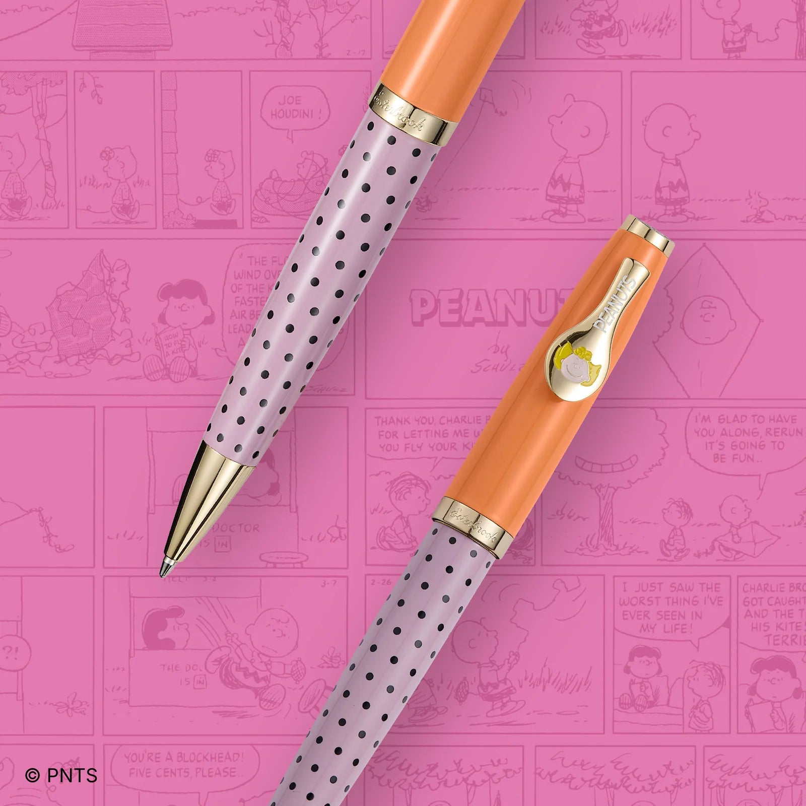 Sally Brown’s playful personality shines in this pink, polka-dotted Esterbrook pen. Perfect for writing a love letter to Linus—or doodling daydreams about school, summer, or the Great Pumpkin. The fountain pen comes in Medium or Fine international #6 nibs with a custom “Good Grief” nib, while the ballpoint keeps everyday notes cheerful. Each pen comes with a matching cloth inspired by Sally’s signature style, so every word you write carries a little of her charm.