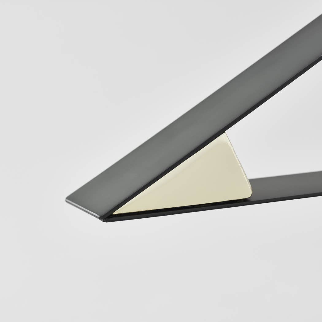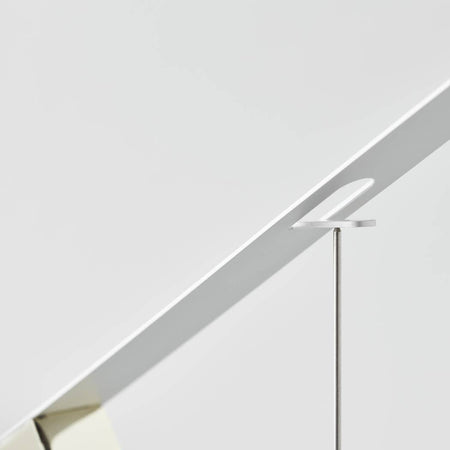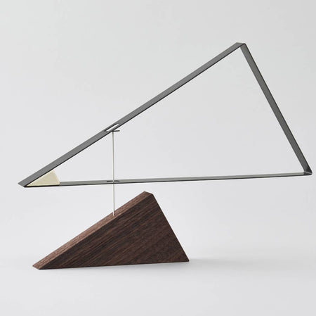This mobile is made up of three triangles. The aluminum frame is the largest and lightest part, the small steel block maintains the overall balance, and the walnut wood base supports both the frame and the block. The proportions of these three triangular parts are all the same. The rhythm and balance created by the three different materials of the triangle creates a soft and calm time, as if sailing on the sea. The balance is adjusted so that the base of the aluminum frame is horizontal. The balance point supported by the pillars is different for each one. An exquisitely balanced mobile born from delicate handwork. In order to deliver the completed design to as many people as possible, we consider the manufacturing method from the perspective of industrial design and value delicate handwork down to the smallest details.