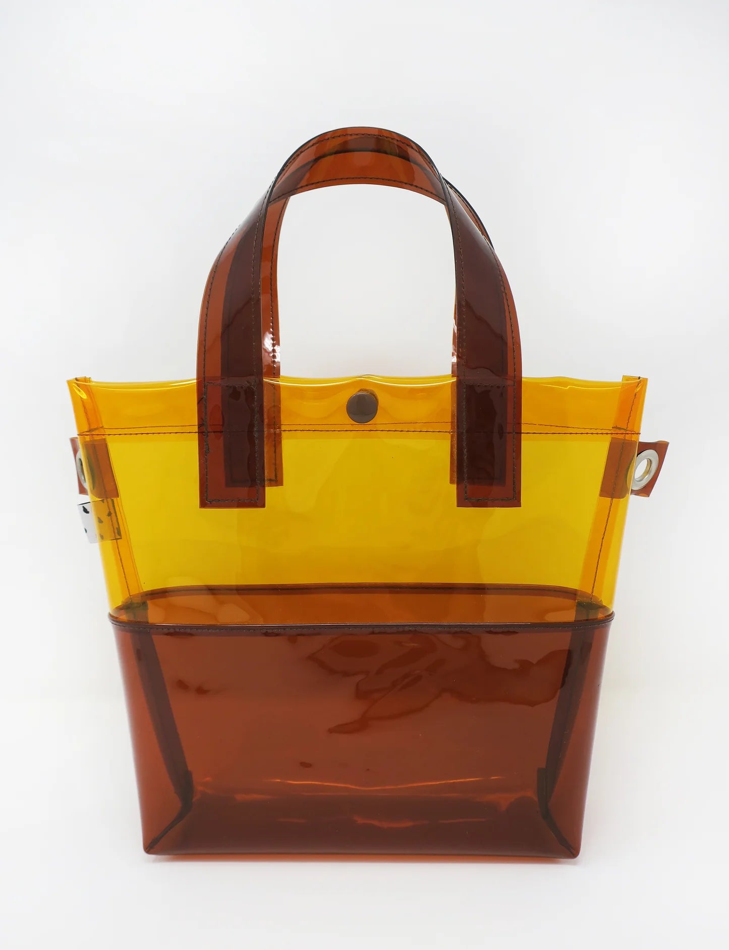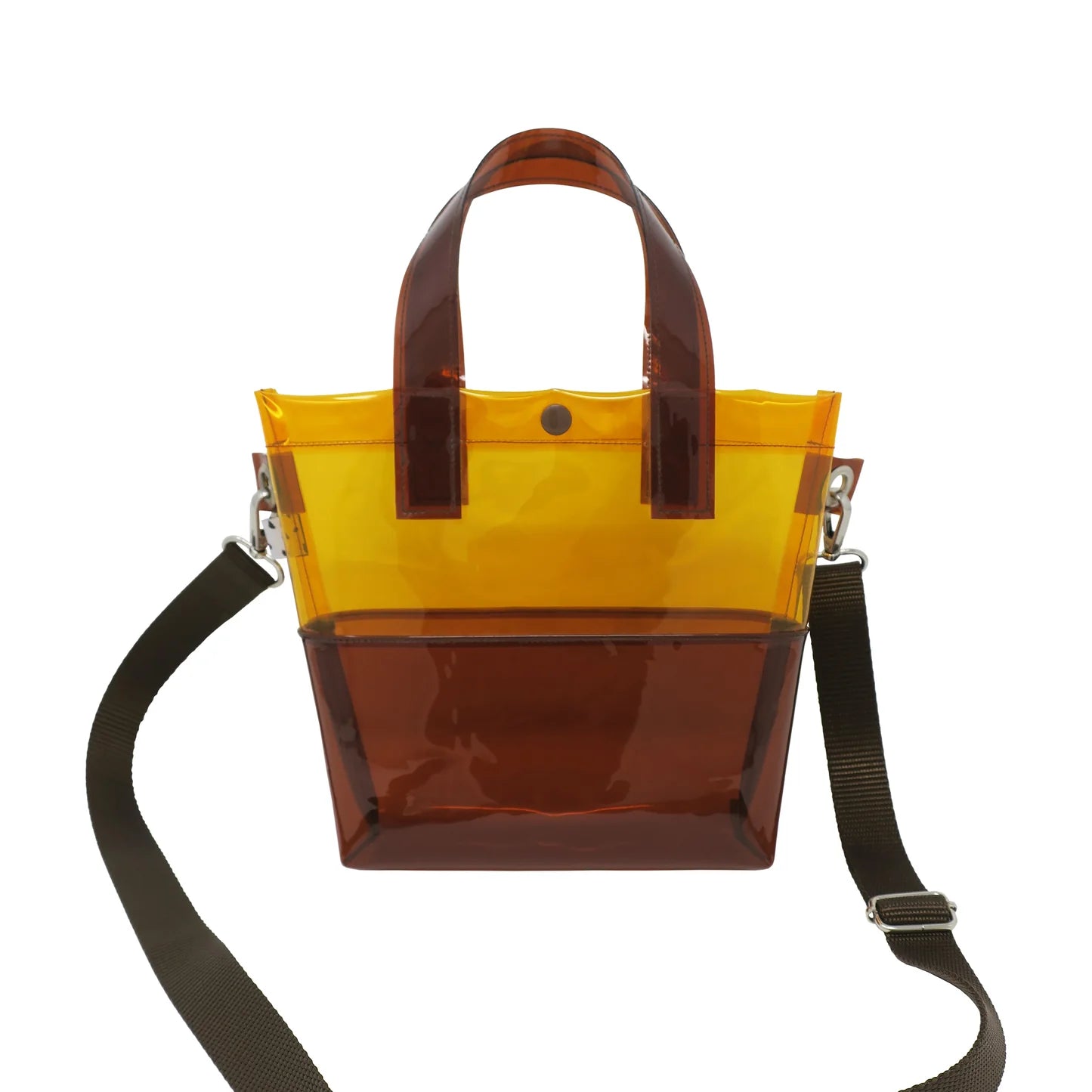 Miss your jelly sandals? This is your new favorite bag! Keep everything inside with a snap. The amber and brown transparent vinyl handle bag has a brown snap closure and is detailed with silver metal grommets. It's available with or without the detachable brown 1" wide strap!