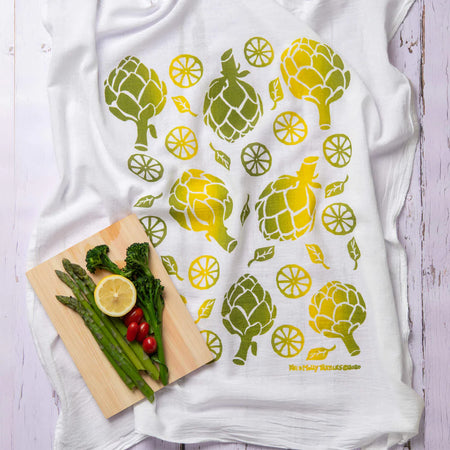 Artichokes remind us that sometimes you have to do the work to get to the heart of the matter! Never eaten one? You're in for a treat. Peal away at the layers, spoon out the choke, and you're left with the tender heart. This variegated print brings the artichokes, citrus slices, and basil leaves to life. The perfect gift for the foodie in your life!