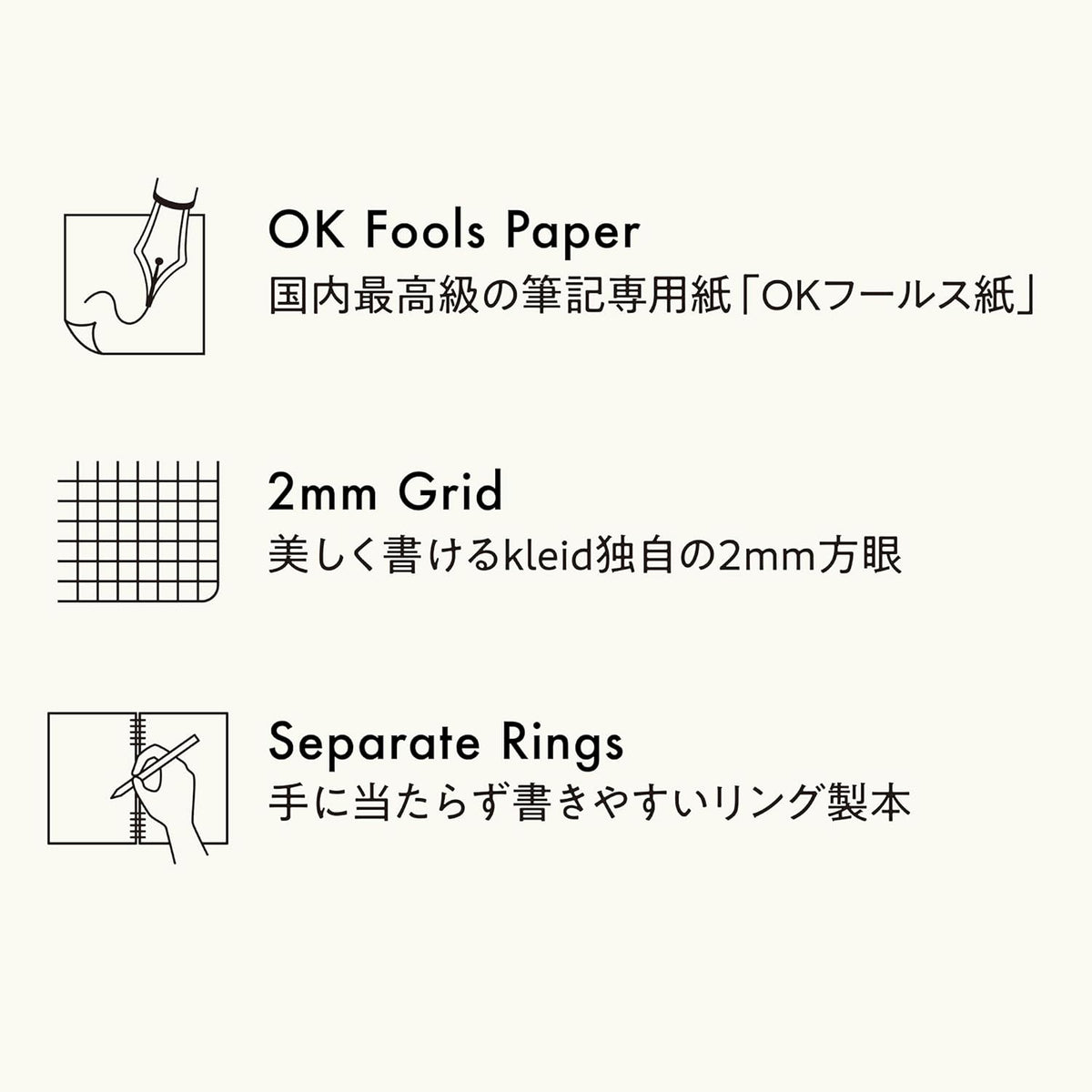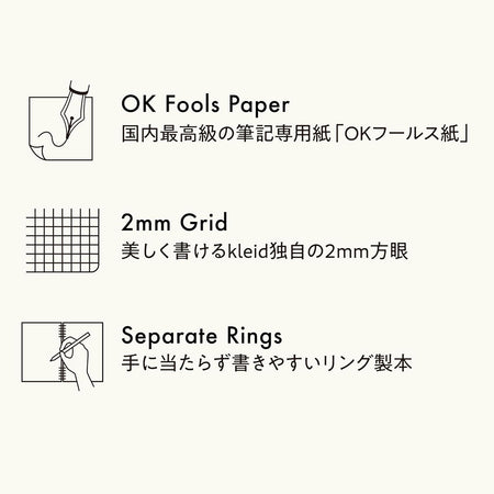 The eye-catching cover, featuring luxurious foil detailing, is made from durable and long-lasting PP material. It features high-quality writing paper "OK Fools Paper" with a 2mm grid with guides for easy page division. Ring binding makes writing easy without rubbing against the hand, and other features make this a classic yet modern notebook that will become kleid's new icon. The B5 size is recommended for desk use and those working from home. Available in two colors and five styles.