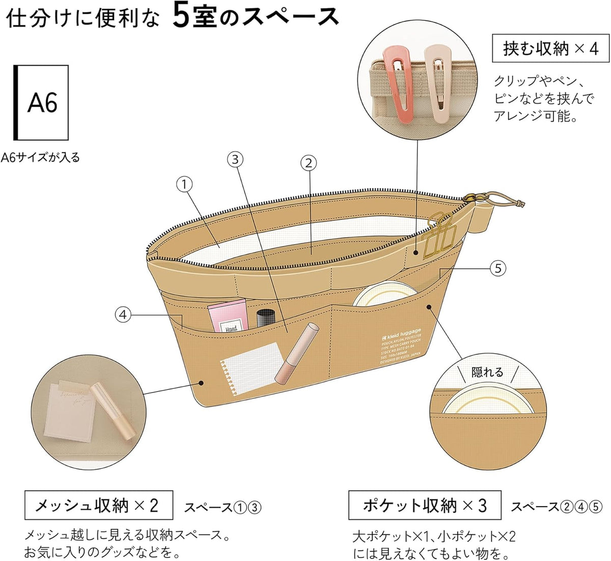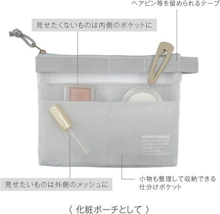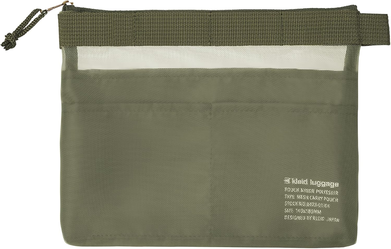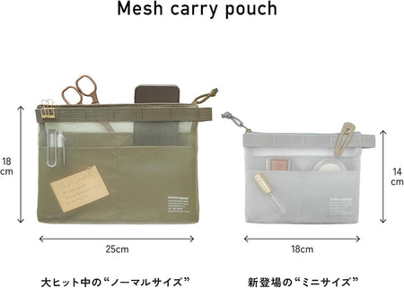 This mesh carrying pouch is perfect for carrying an A5 notebook, a smartphone, and a large assortment of pens and other accessories. The mesh construction protects the contents from scratches while letting you show them off. The inside of the pouch is divided into three sections, with an opaque middle pocket and two smaller pockets for additional organization. Two smaller pockets inside the pouch provide additional room for organization. The outside of the pouch features a carrying loop and six additional loops along the zipper for attaching extra pens, binder clips, or other small accessories.
