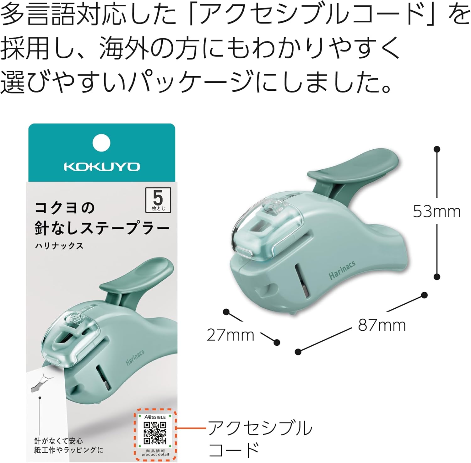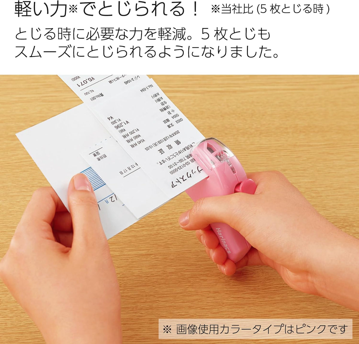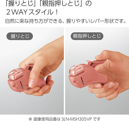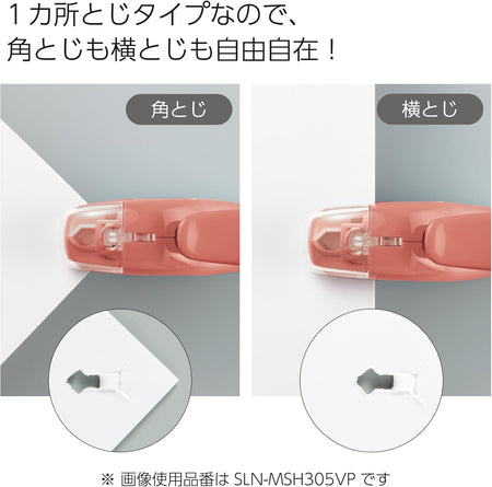 This stapler is thoughtfully designed for easy use. Its compact body fits snugly in the hand, and it doesn't require a lot of force to press down. A clear window lets you see where you are stapling so that you don't accidentally staple over a line of text. Its small size also makes it easy to store and carry. Keep it handy in your pencil case, slip it into a drawer, or hang it on the wall by threading a strap through the small hole under the handle.