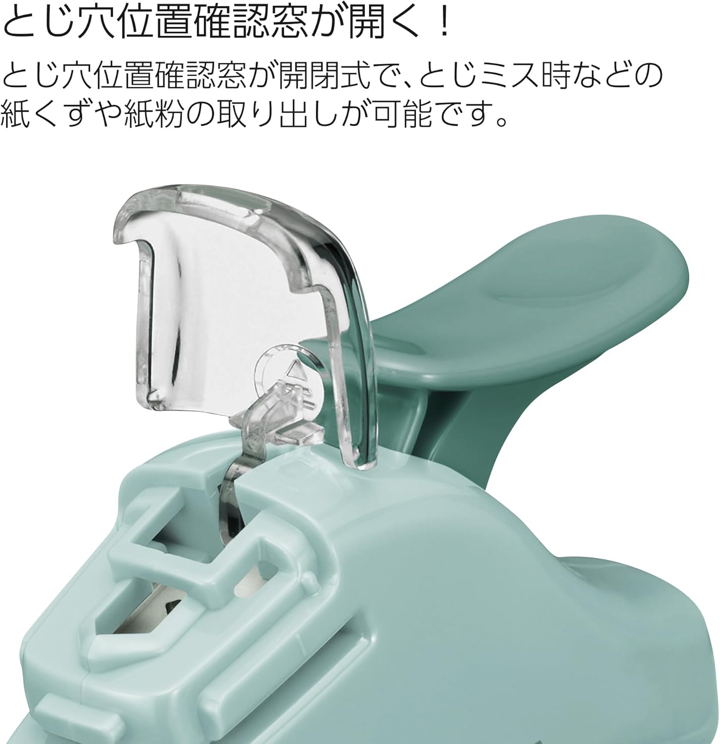 To use this stapler, slide up to 5 sheets of paper into the slot and press down. If you need an extra-strong hold, staple the paper twice at the corner so that the stapled holes form a 90° angle. This is useful for thinner paper and documents that need to stand up to extensive flipping. To discard accumulated paper debris, slide the clear window forward and flip it open over a trash can.