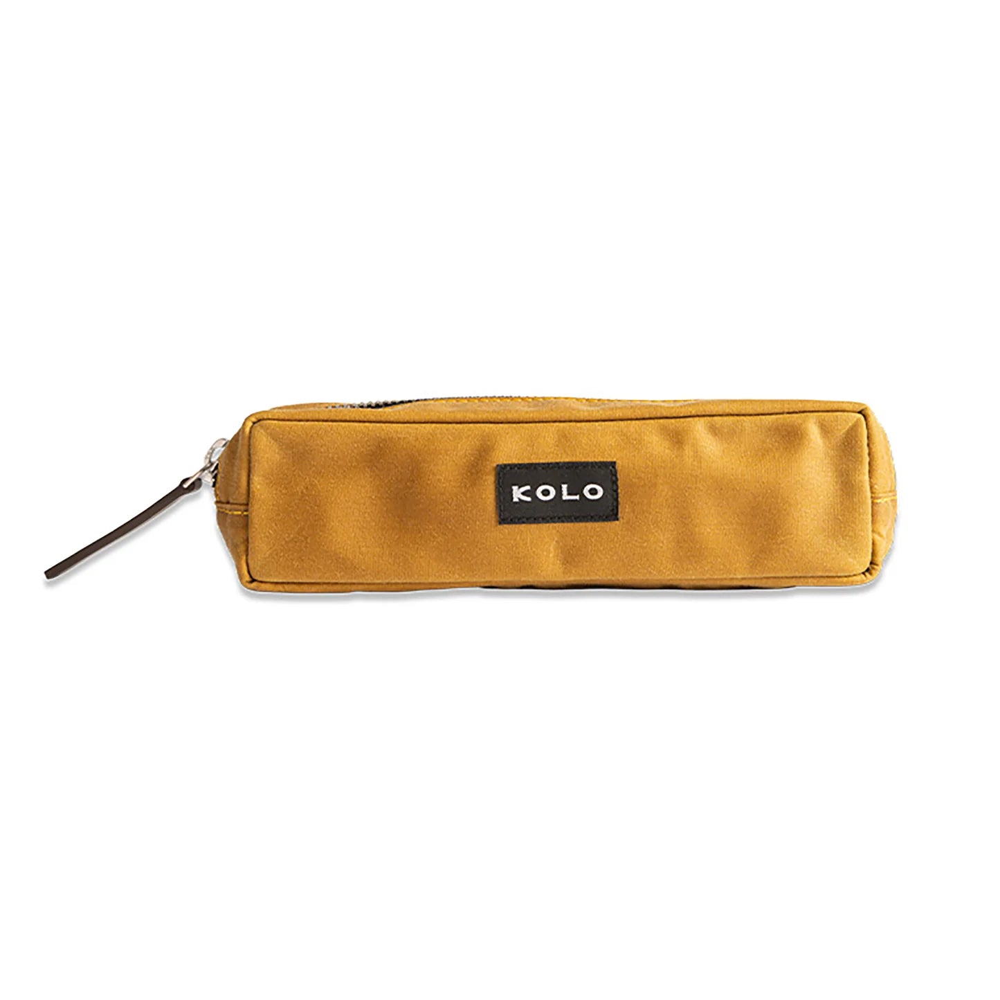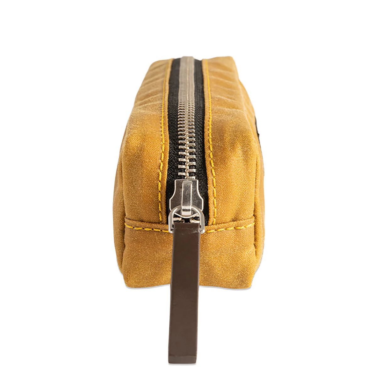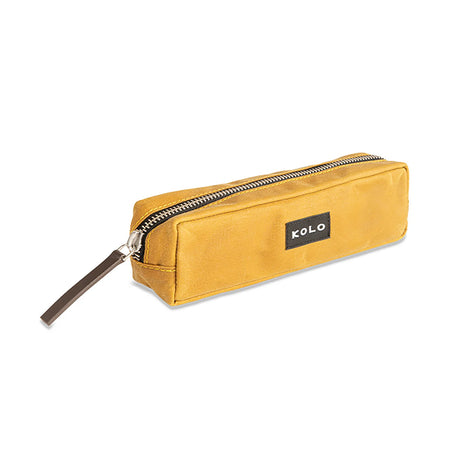 Organic cotton canvas pouch for creative tools. Weatherproof wax coating: durable and stain-resistant. Two-way, solid brass zipper with nickel matte finish. Store pens, pencils, brushes, and erasers for easy carry.
