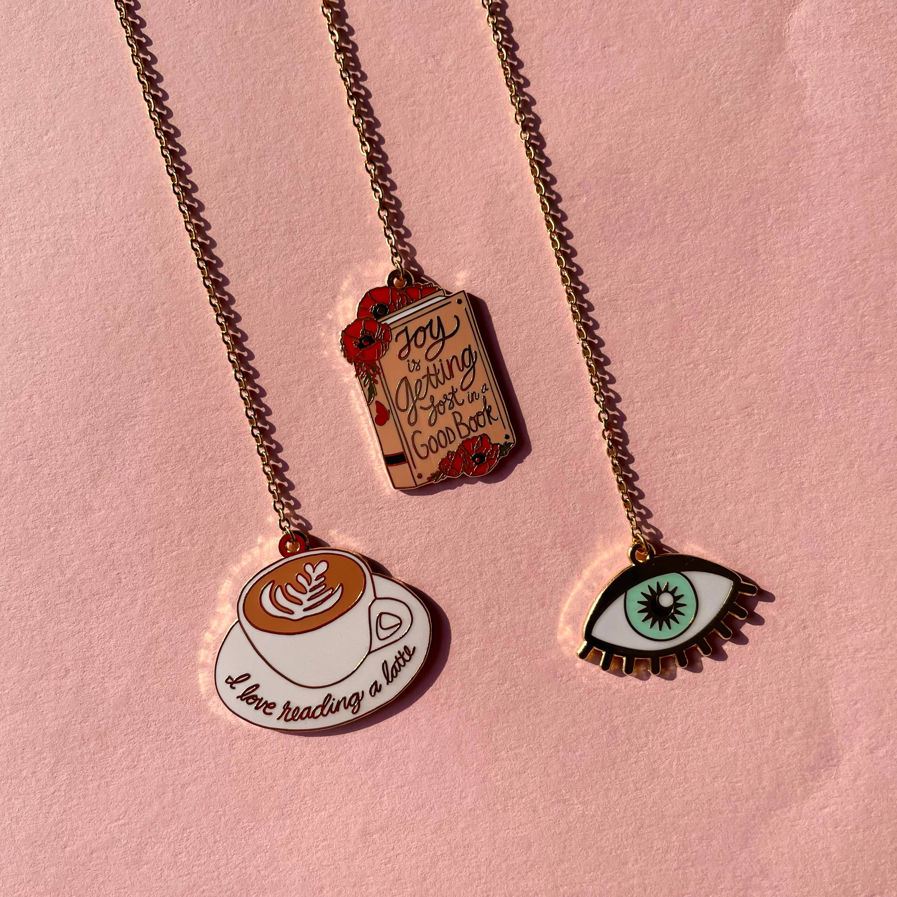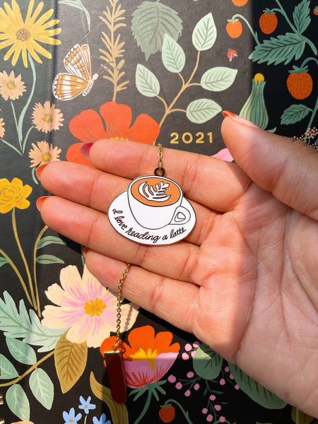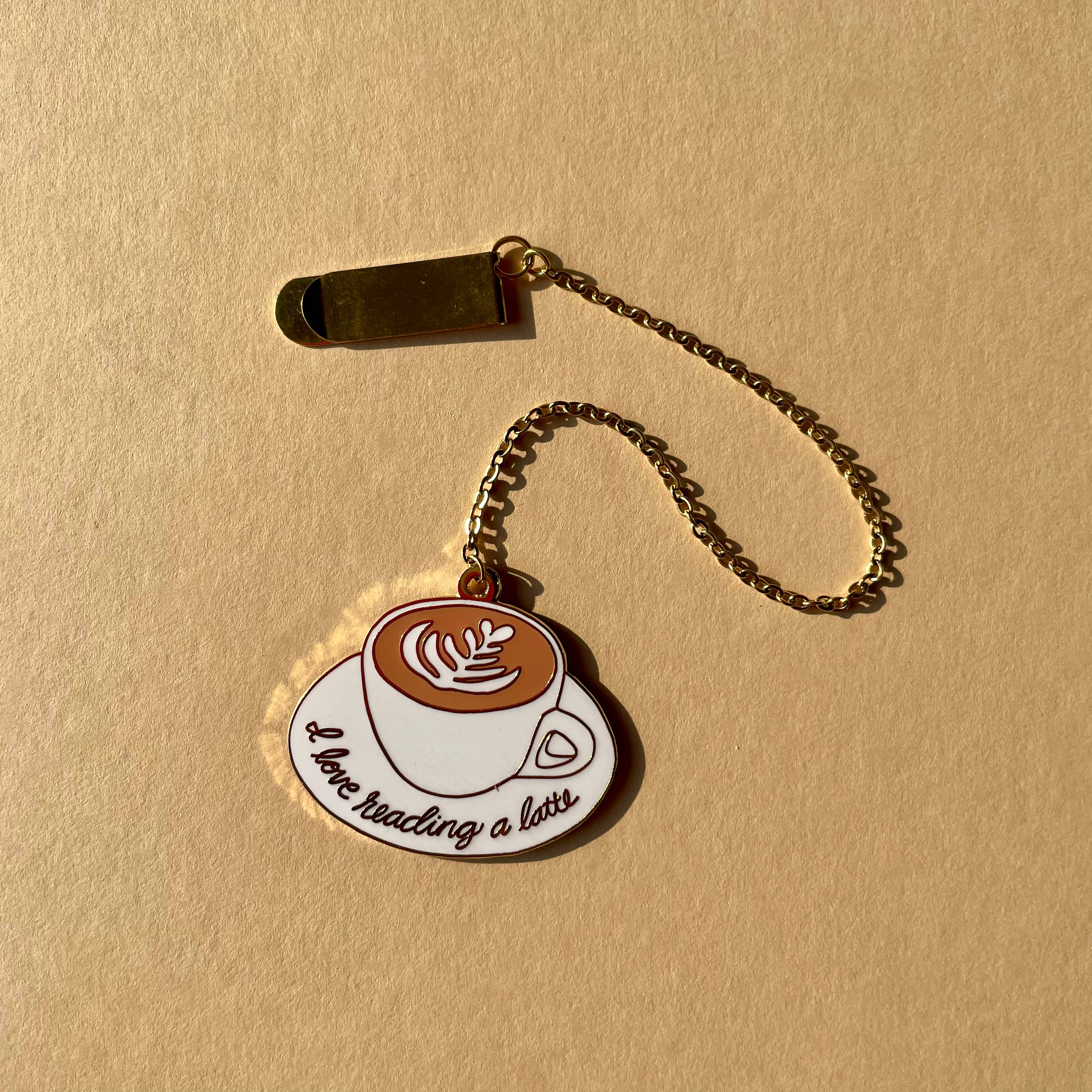 Save your place in style with this gorgeous enamel chained bookmark featuring a hand drawn illustration of a latte and the saying "I love reading a latte." Perfect for any book lover!