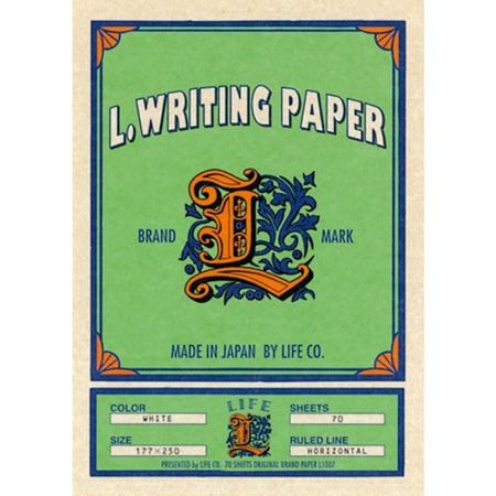 Life Brand Letter Pad - B5 - White Paper. This letter pad is an B5 size letter writing pad with a vertical orientation. The beautiful textured cover has a vintage aesthetic and lettering design giving it an antique feel. Inside, you will find 70 sheets of lined white paper with a line spacing of 0.4 in (1 cm). The luxuriously smooth Life L. Writing Paper is perfect for fountain pens, gel pens, broad rollerball pens and great with pencil too.