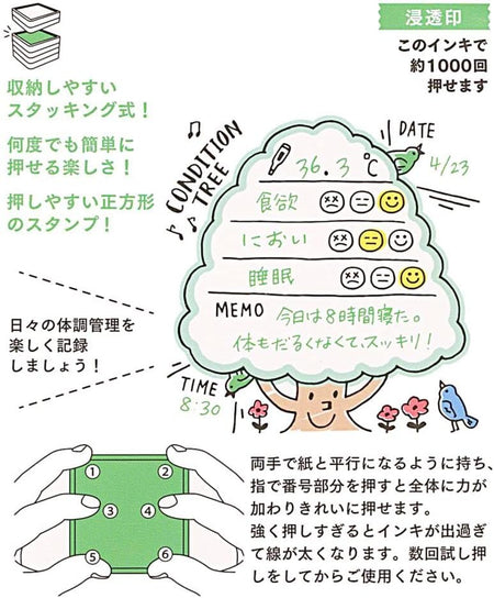Take off the cap, place the stamp flat on the paper and push it down with both hands. You can make a darker stamp by pushing harder or holding the stamp down for longer. The picture is around 50mm high x 50mm wide.