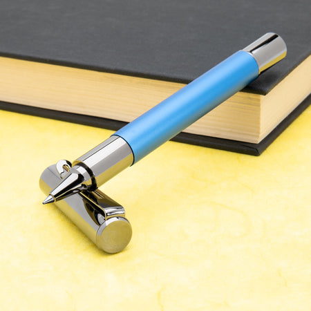 The Monteverde Ritma Rollerball in Blue features a sleek, minimalist design inspired by the 1960s and 70s. Crafted from aluminum with a matte anodized finish and polished gunmetal accents, this pen offers a balanced, heavyweight feel. Its secure magnetic cap pops open with ease and posts safely at the back. The rollerball tip twists out smoothly for precise writing. Combining stylish simplicity with functional engineering, this pen is ideal for those who appreciate refined craftsmanship and vibrant color in their writing instruments.
