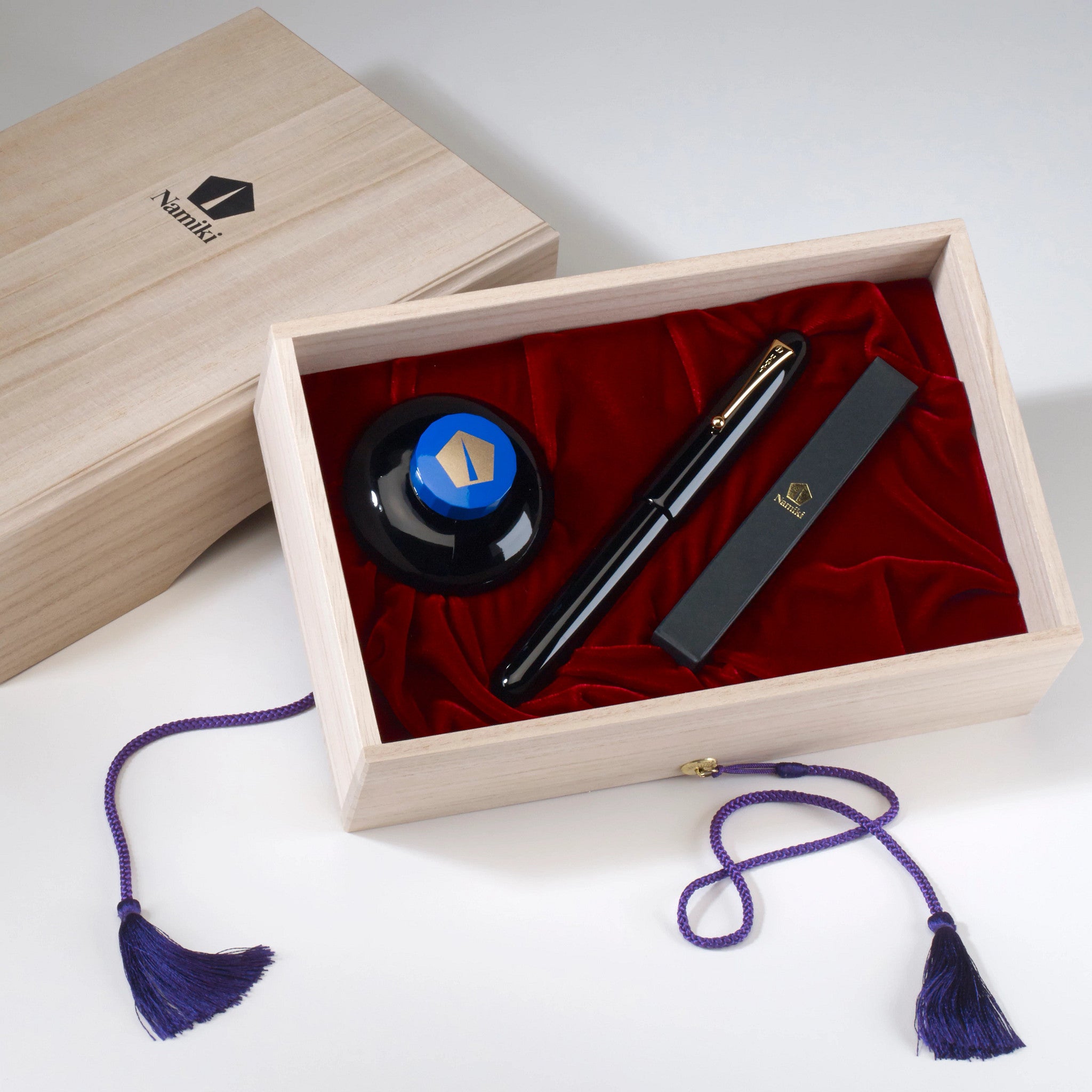 The Emperor Collection is Namiki's highest ranking series. This Namiki Emperor urushi lacquered fountain pen is hand crafter by maki-e artisans (kokkokai) in Japan. Each pen takes months to make. This fountain pen's 18k gold nib is a massive #50 size. The pen fills by eyedropper which allows it an incredibly large ink capacity. The pen comes packaged in a gorgeous presentation wooden box with a bottle of ink. Since each pen in one-of-a-kind, Namiki stands by their product and offers a lifetime warranty and excellent customer service.