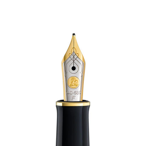Souverän - A world-famous classic. Even today, this classic with a black-and-green pinstripe sleeve is still considered a symbol of the Pelikan brand worldwide. The production of the Souverän sleeve is subject to an elaborate process. The typical, striped material is made out of cotton based on a formula developed specially for Pelikan. It takes months until the block providing the stripes is finished, whereupon the tailor-made plating is curved and cut into a contour using a natural diamond. The characteristic double rings are then integrated into the cap and barrel with the utmost precision. The writing instrument is then polished until it reaches a brilliant luster. The fountain pen M400 with piston filling mechanism consists of a 14-carat bi-color gold nib with rhodium trim.
