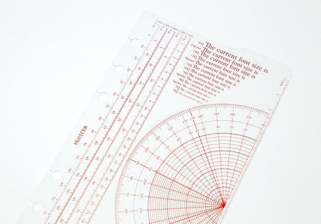 The Ruler Pad is a scale ruler, protractor, character size reference, line width chart, and grid templates all-in-one. The upper right corner has a protrusion that is designed to be an index tab so you can quickly access the page you need even after closing the ring leather binder. The keyhole ring design makes it easy to remove and reposition wherever you like. Enjoy a wide variety of scales and line width guides to assist your creative work.