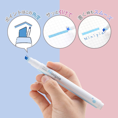 These uniquely designed pens are 2-in-1 highlighters and fineliner markers! Unlike double-sided pens, which require switching sides and recapping to use, the Ninipie's highlighter chisel tip and fineliner are conveniently located next to each other on one end. To switch tips, simply rotate the pen.